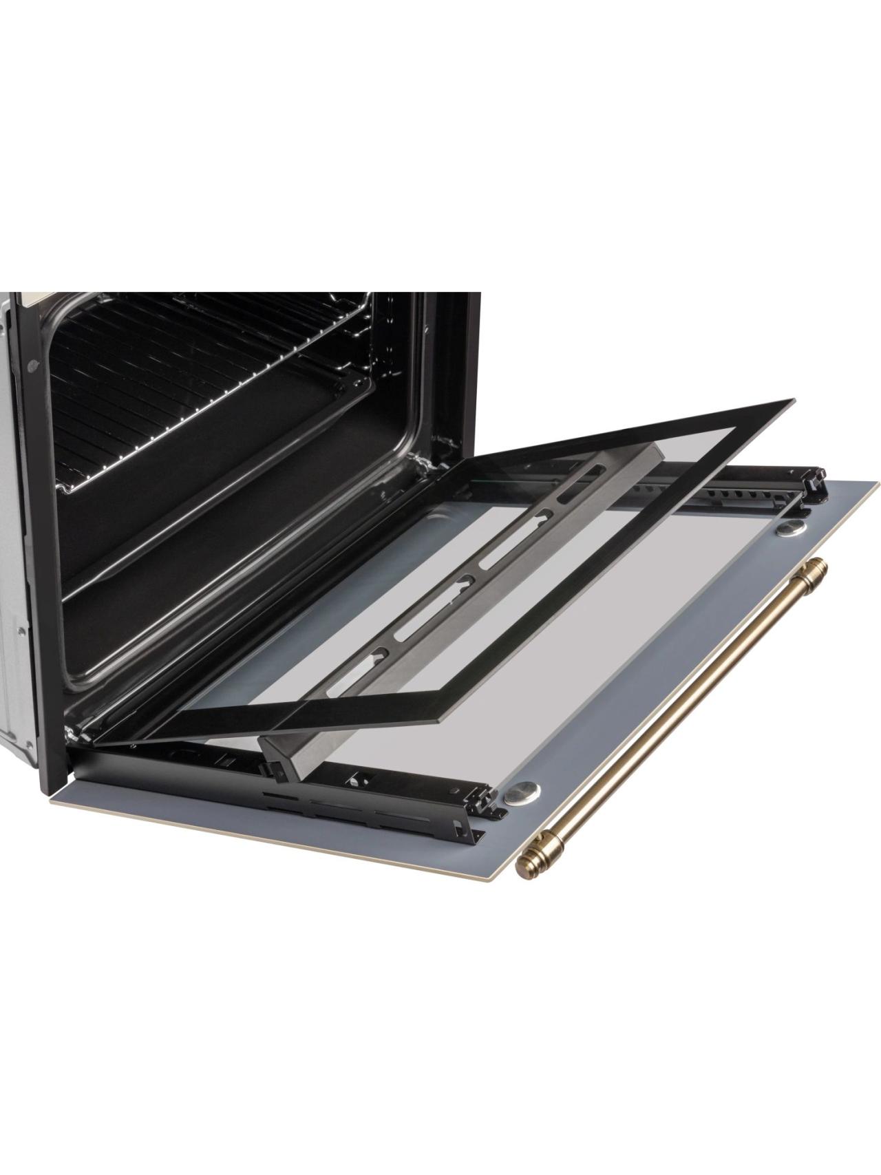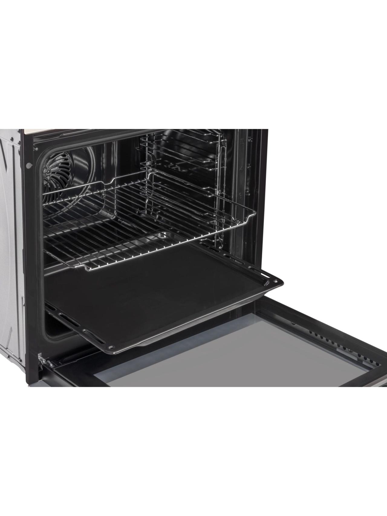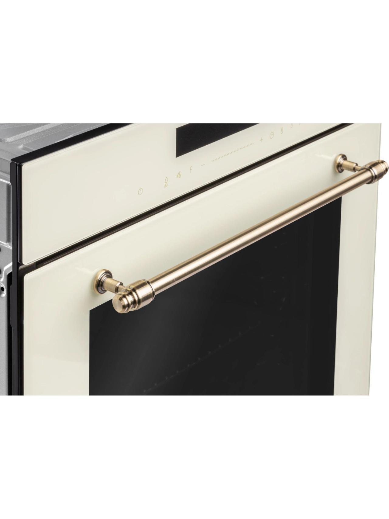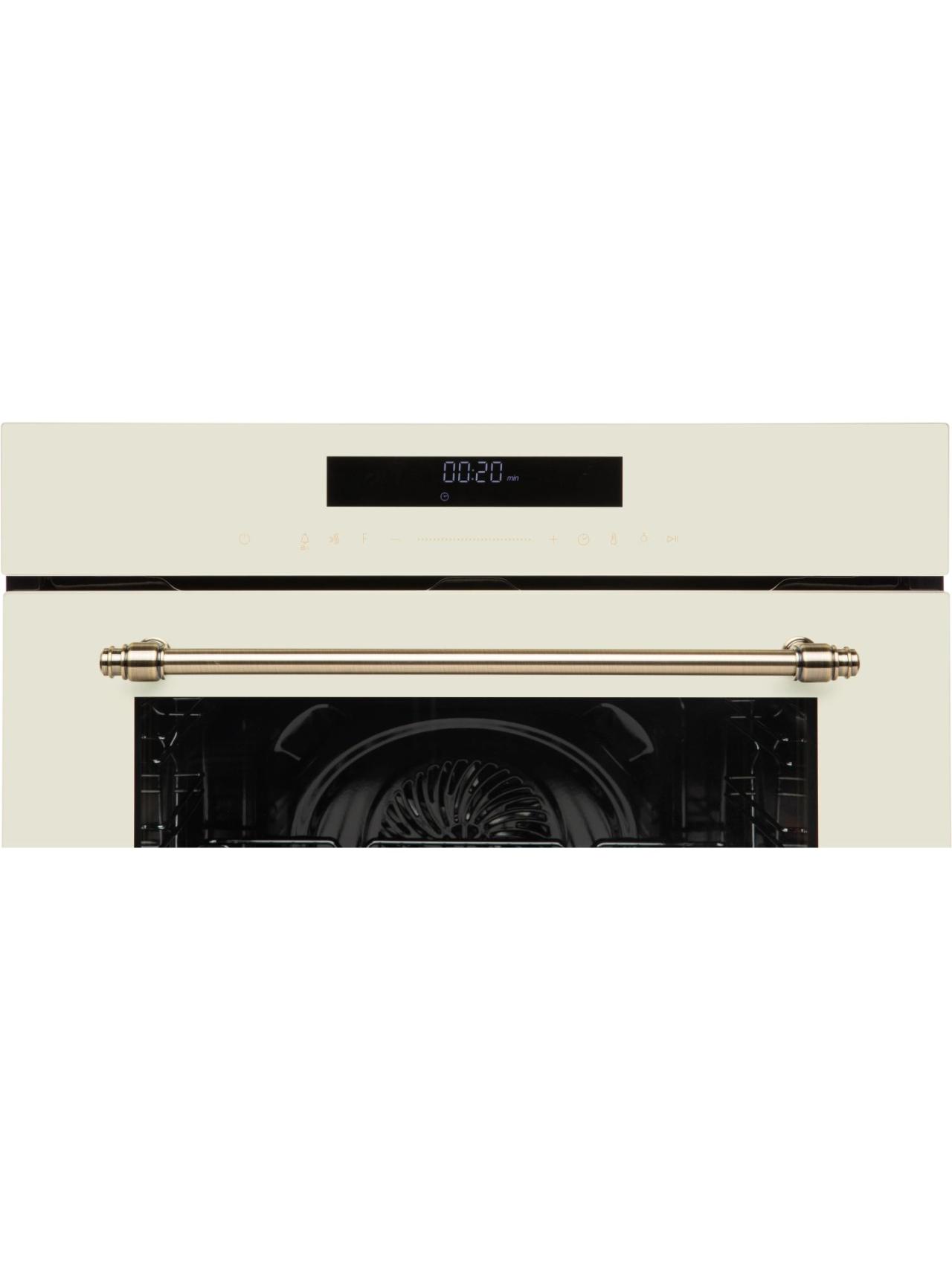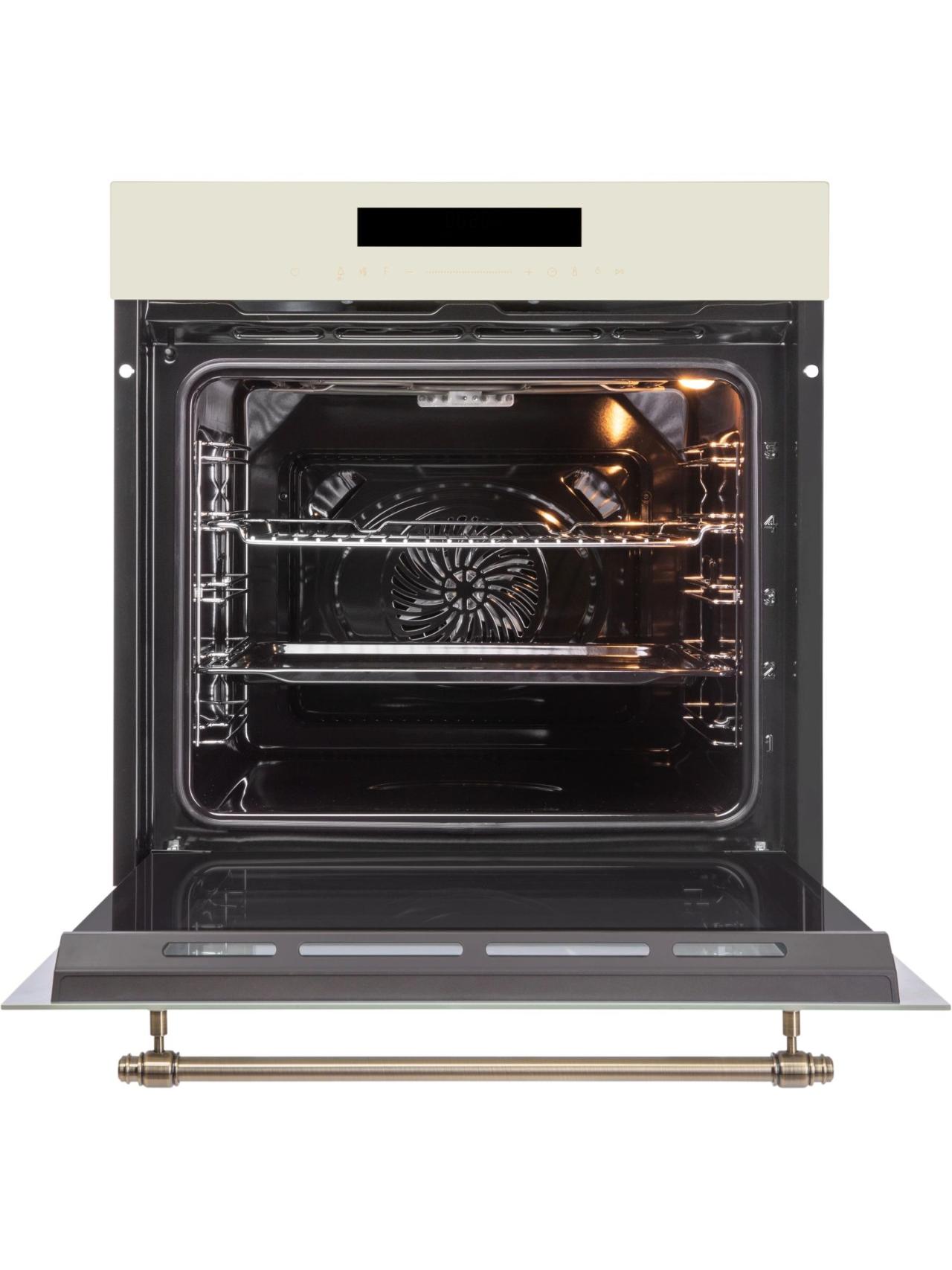 Модель шириной 59,5 см выполнена в классическом стиле. Стеклянный фасад бежевого цвета добавляет технике изысканности. Дверца духового шкафа оснащена тройным съемным стеклом. Это позволяет легко разобрать дверцу и тщательно очищать каждое стекло по отдельности. Внутреннее покрытие духового шкафа — эмаль легкой очистки. Она защищает внутреннюю часть духовки от коррозии металла, отталкивает жир и влагу, что способствует максимальному упрощению процесса уборки камеры. Лампа подсветки мощностью 25 Вт обеспечит хорошую видимость в процессе готовки, а вентилятор охлаждения предотвратит перегрев устройства.