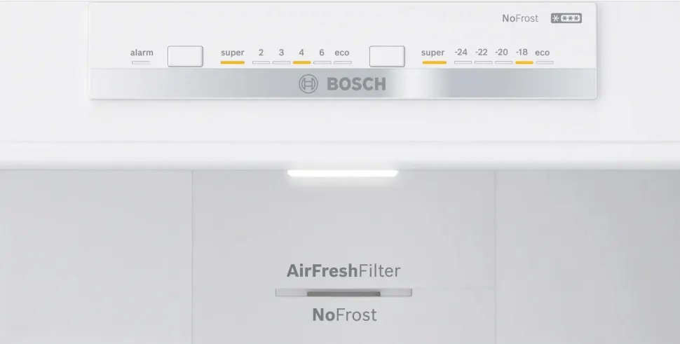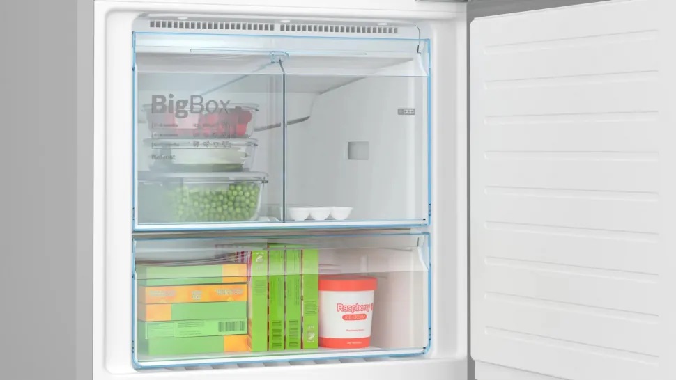 Сердце холодильника Bosch KGN55VL21U — это многофункциональная зона свежести. Большой изолированный ящик представляет собой влажную зону VitaFresh, специально предназначенную для фруктов, овощей и зелени. Пользователь может установить один из двух уровней влажности, создавая оптимальный микроклимат для сохранения витаминов, сочности и хрустящей текстуры продуктов на несколько дней дольше. Это, в сочетании с мощной многопоточной системой охлаждения и системой No Frost в обеих камерах, гарантирует равномерную температуру без образования инея, предотвращает смешивание запахов и обеспечивает идеальные условия для всех категорий продуктов.