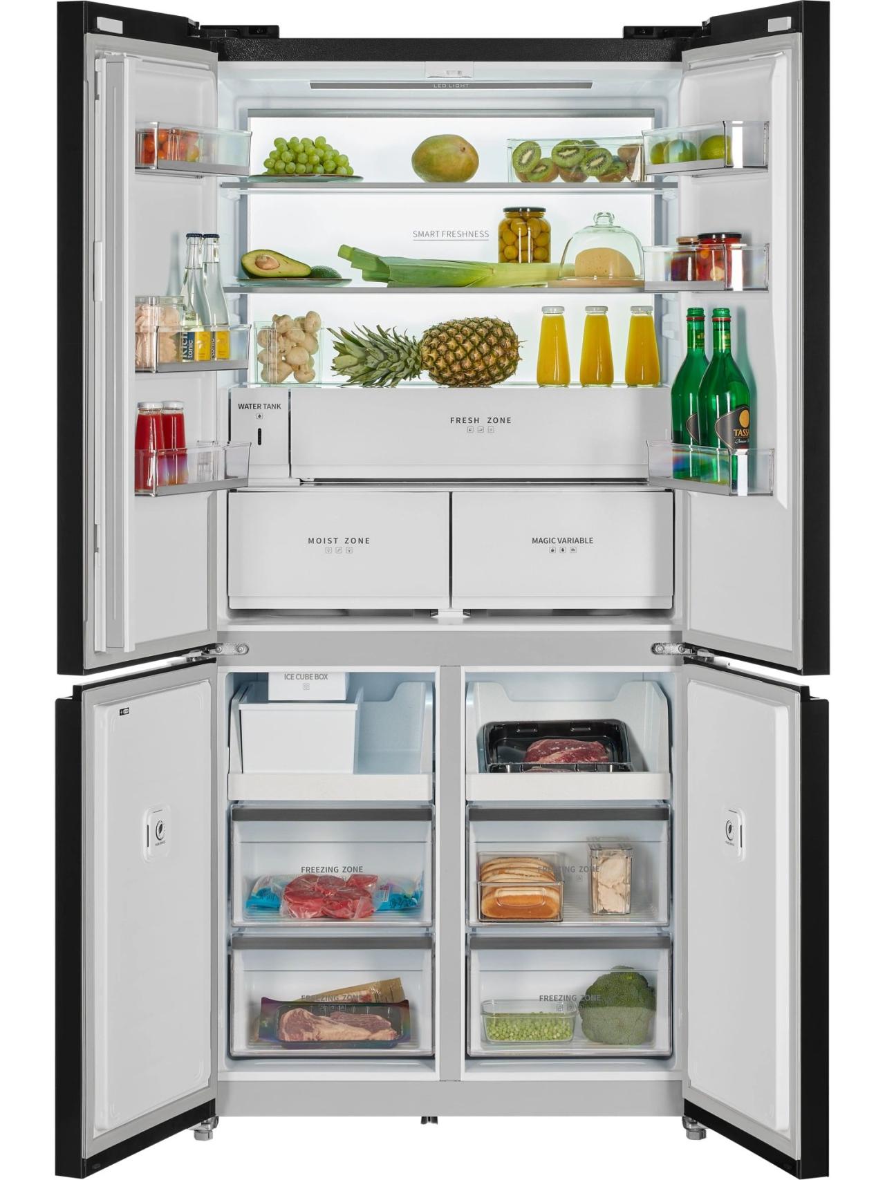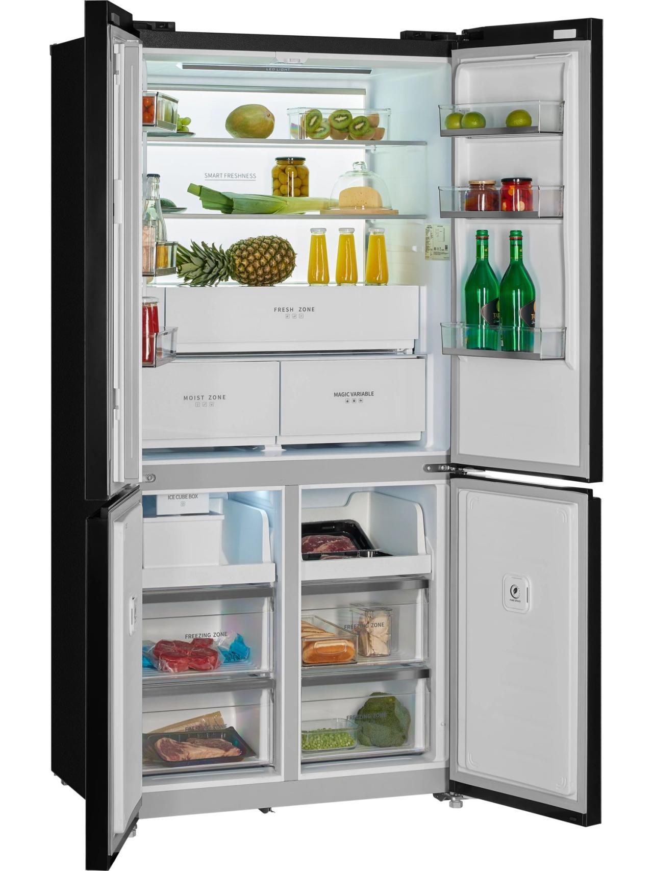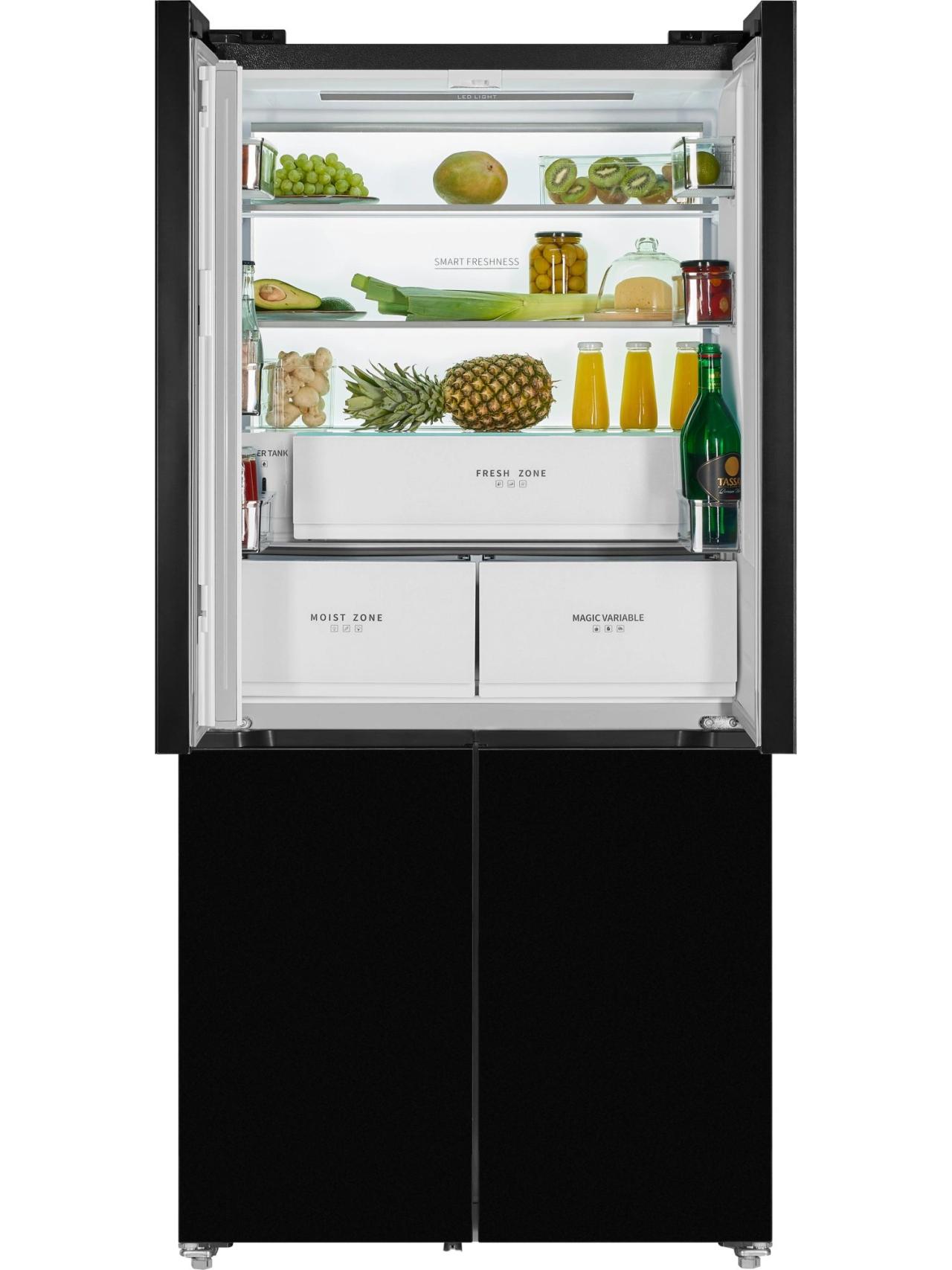 HIBERG i-RFQ 705G B — это четырехдверный холодильник с элегантным фасадом из черного стекла, созданный для тех, кто ценит вместительность, порядок и стиль на кухне. При высоте 191 см и глубине всего 60 см модель аккуратно встраивается в кухонный гарнитур, сохраняя чистые линии интерьера и удобство доступа к полкам и ящикам. Ключевое преимущество — общий объем 600 л, которого достаточно как для семейных запасов, так и для частых приемов гостей.