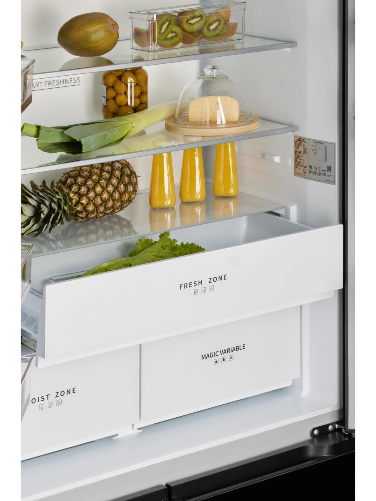 Внутри — продуманная эргономика и интеллектуальное хранение. В холодильной камере три выдвижных ящика на металлических направляющих: отдельный овощной с регулятором влажности и просторная FLEX ZONE с выбором -4, 0 или +4 °С для мяса, напитков или фруктов. Полки из закаленного стекла, вместительные карманы на дверцах и мягкая Ambient-подсветка создают премиальный пользовательский опыт. Отдельно стоит отметить компактный корпус с глубиной 60 см, что особенно удобно для современных кухонь без зазоров.