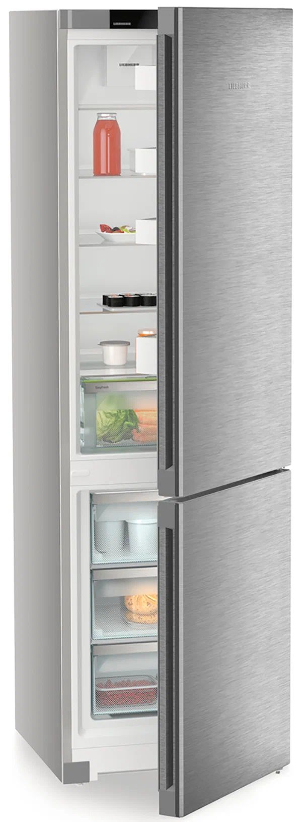 Liebherr CNsdc 5703-22 001 — двухкамерный холодильник для тех, кто ценит продуманную эргономику и аккуратный внешний вид. Поверхность SmartSteel с горизонтальной шлифовкой подчеркивает нержавеющую сталь, защищает от отпечатков и устойчивее к царапинам, а утопленная вертикальная ручка поддерживает минималистичный дизайн и удобство открывания. NoFrost в морозильном отделении избавляет от образования льда и ручного размораживания, экономя время и энергию.
