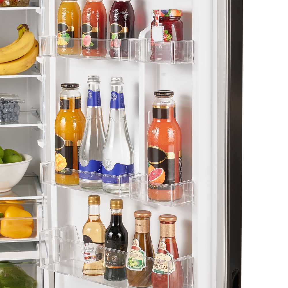 За равномерное распределение холода отвечает динамическое охлаждение: специальный вентилятор поддерживает оптимальные условия на каждой полке и в любом отделении. Внутреннее пространство продумано для гибкой настройки — высота полок и отсеков регулируется, полки выполнены из закаленного стекла, а комплектация включает подставку для яиц и форму для льда.