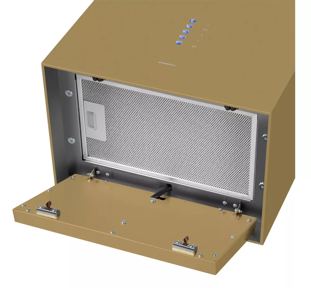 Технология забора воздуха по всей площади вытяжки. Жиропоглощающий фильтр прикрыт стеклянной панелью. Она не блокирует доступ к нему, придает устройству эстетичный внешний вид и упрощает уход.