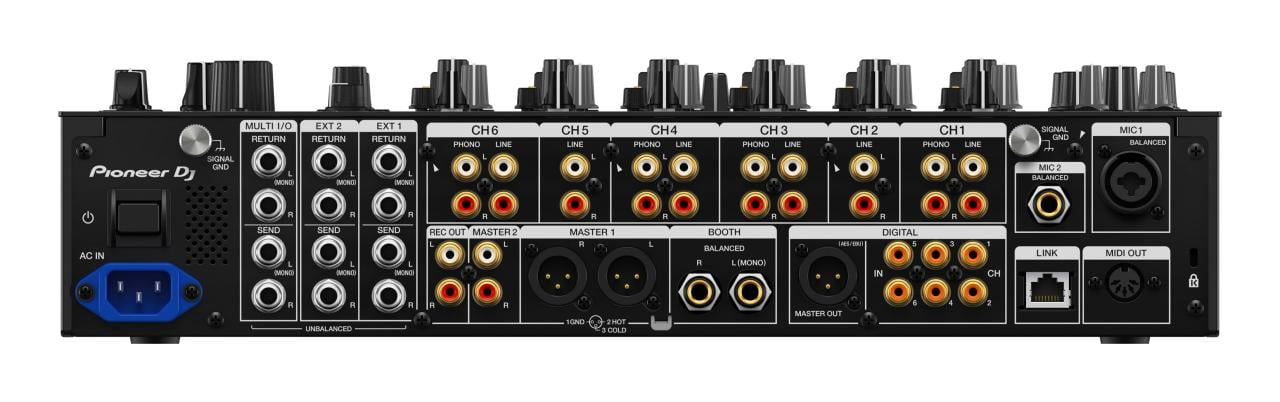 Выходы: 2 x Master (XLR, RCA), 1x Booth (6,3 мм TRS), 4 x выхода для наушников (6,3 мм, 3,5 мм), 1x AES/EBU, 1x Rec Out (RCA), 1x MIDI