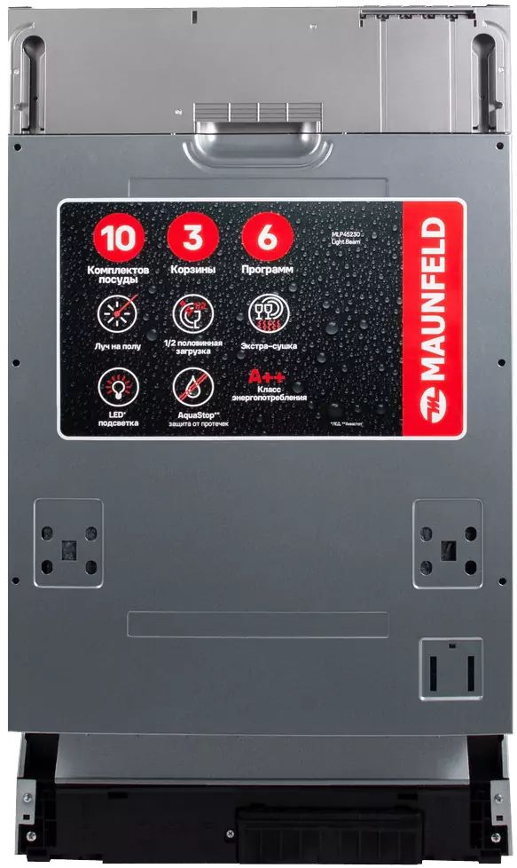 Встраиваемая посудомоечная машина MAUNFELD MLP45230 Light Beam — это узкая, но вместительная модель шириной 45 см (вместо классических 60 см). За раз она может вымыть до 10 комплектов — это оценят в больших семьях, а также те, кто любит готовить и часто принимает гостей.