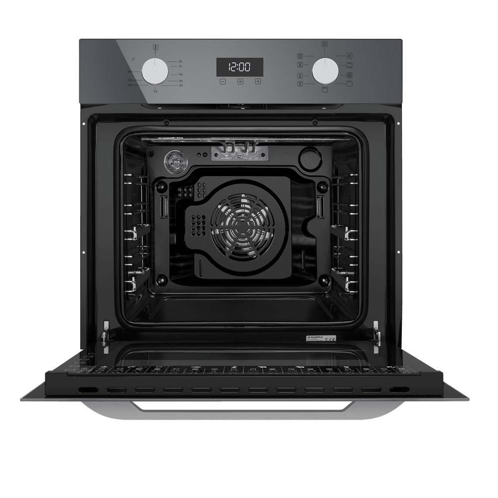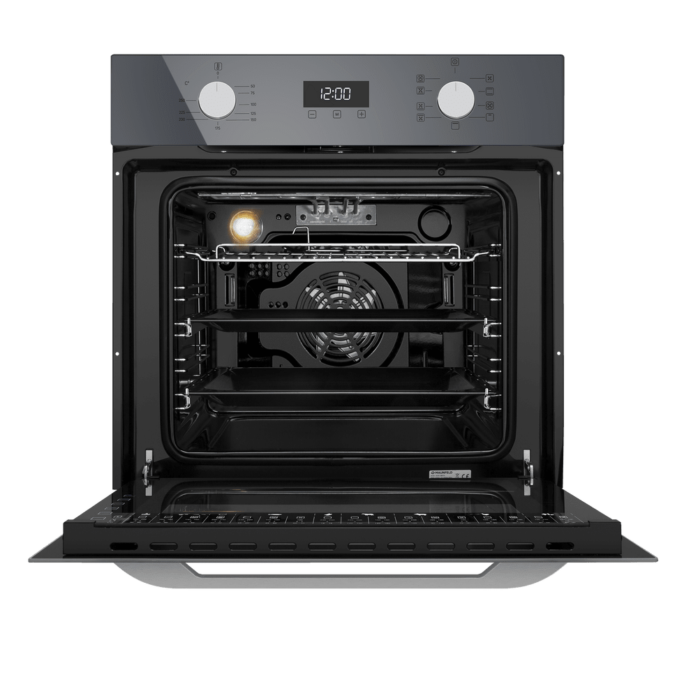 Внутри — черная эмаль легкой очистки, которая облегчает уход после запекания. Оснащение продумано для ежедневного комфорта: яркая подсветка, электрический гриль, конвекция и два уровня телескопических направляющих, чтобы безопасно выдвигать противни без риска проливов.