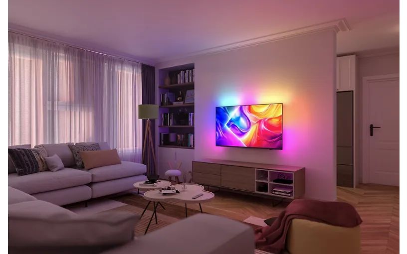 Система обработки изображения Philips P5 и экран 4K QLED обеспечивают кристально чёткую картинку с насыщенными цветами. Благодаря технологиям Dolby Vision и Dolby Atmos каждая сцена воспроизводится с кинематографической точностью. Фирменная подсветка Ambilight усиливает эффект погружения: встроенные светодиоды реагируют на изображение и создают цветное сияние вокруг телевизора.