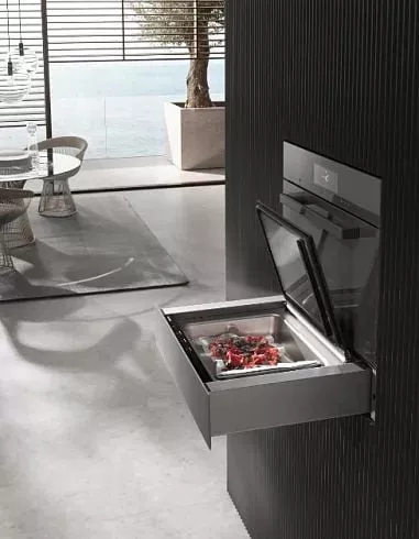 С помощью вакууматора Миле EVS 7010 BRWS можно делить на порции, если нельзя сохранить продукты полностью, упаковывать, мариновать, а также подготавливать, овощи, мясо и рыбу к готовке в режиме Sous-vidе. Полный объем внутренней камеры - 8 литров, что обеспечивает сохранение даже больших пакетов с едой. Устройство открывается без ручки по современной технологии Push2open, нужно просто нажать на внешнюю панель и ящик откроется. Прибор управляется с помощью сенсорных кнопок и символьных надписей на панели управления. Степеней вакуумирования всего 3. О достижении каждой из них предупредит светодиодная индикация. Также, она подскажет и о том, что надо удалить воду из насоса. Предусмотрена индикация продолжительности запаивания упаковки. Техника сконструирована с учетом потребностей покупателя. Все рассчитано нато, чтобы положить пакет в вакууматор, нажать нужную кнопку и достать пакет через некоторое время.