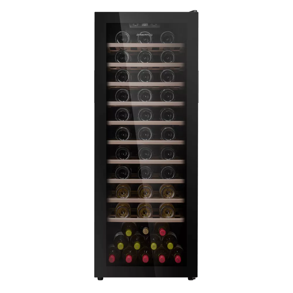 Продуманная компоновка обеспечивает вместимость до 84 бутылок: 10 прочных полок из массива бука удобно размещают бутылки, при необходимости полку можно извлечь и переорганизовать пространство. Светодиодная подсветка мягко подсвечивает этикетки.