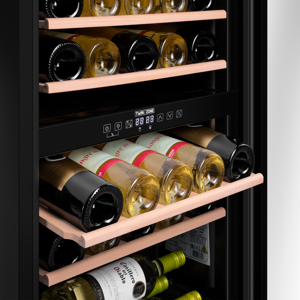 Современный винный шкаф MAUNFELD MFWC-85D28 создаёт идеальные условия для домашнего хранения коллекции. Две независимые температурные зоны позволяют одновременно выдерживать красные, белые и игристые вина, точно подстраивая режим под каждый тип напитка.