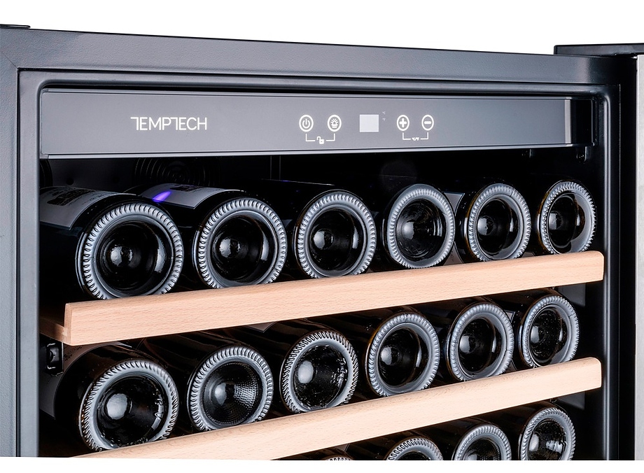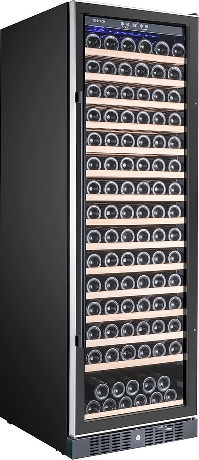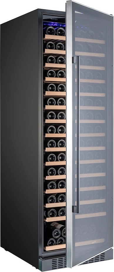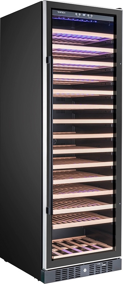 Винный шкаф Temptech Premium WP180SCB предназначен для охлаждения, хранения при оптимальных условиях и демонстрации бутилированного вина различных сортов в барах, ресторанах, специализированных магазинах, подсобных складских помещениях, а также домашних условиях. Модель оснащена монотемпературной холодильной камерой с 15 выдвижными полками, фронтальной цокольной решеткой, распашной дверью на перенавешиваемых петлях с длинной вертикальной рукояткой и прозрачным обзорным остеклением. Корпус выполнен из металла с антикоррозийным покрытием черного цвета, окантовка дверной рамы – из нержавеющей стали, полки – из массива буковой древесины.